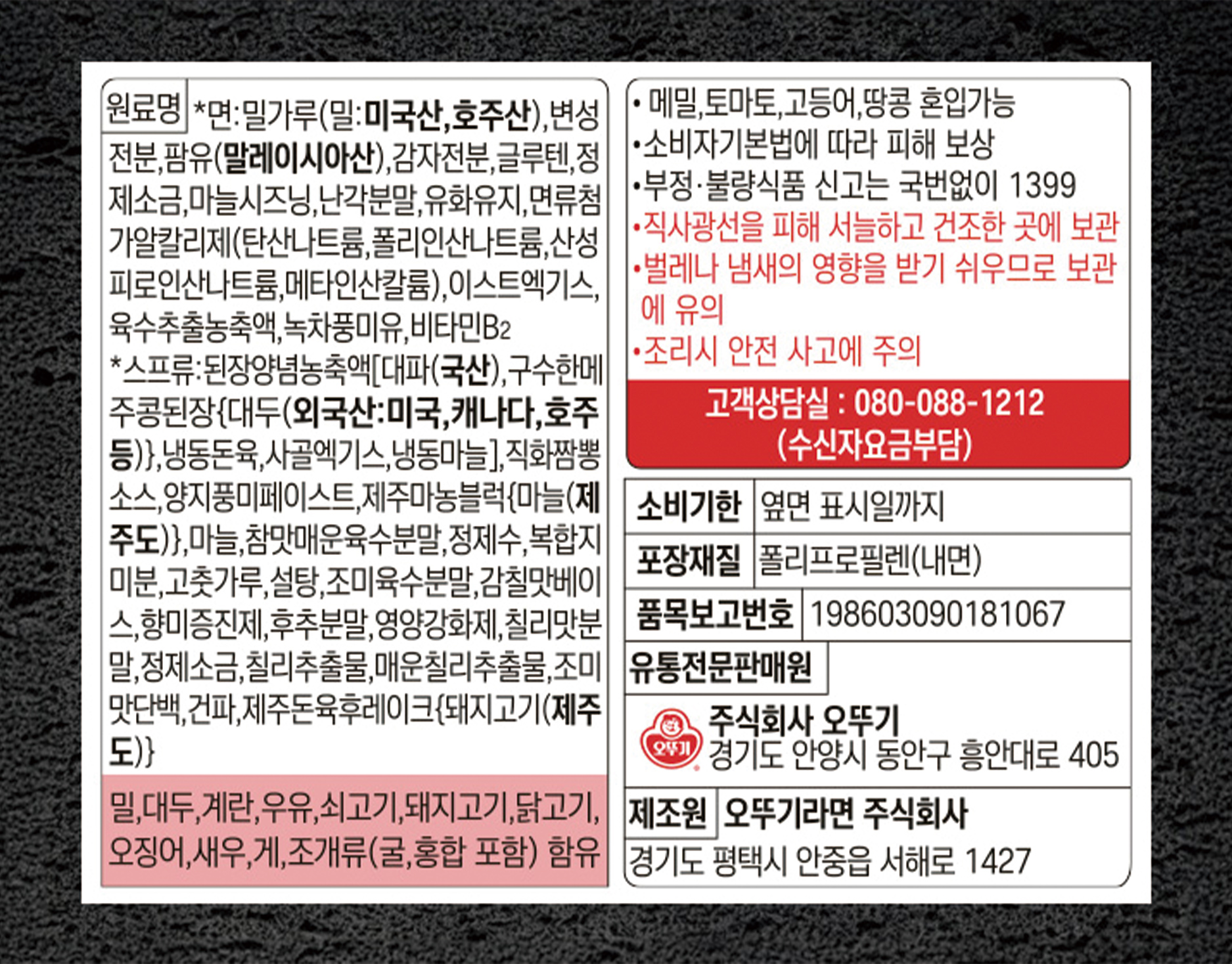 | 소비자 상담 관련 전화번호 | 오뚜기 고객상담실 : 080-024-2311(수신자 요금 부담) |