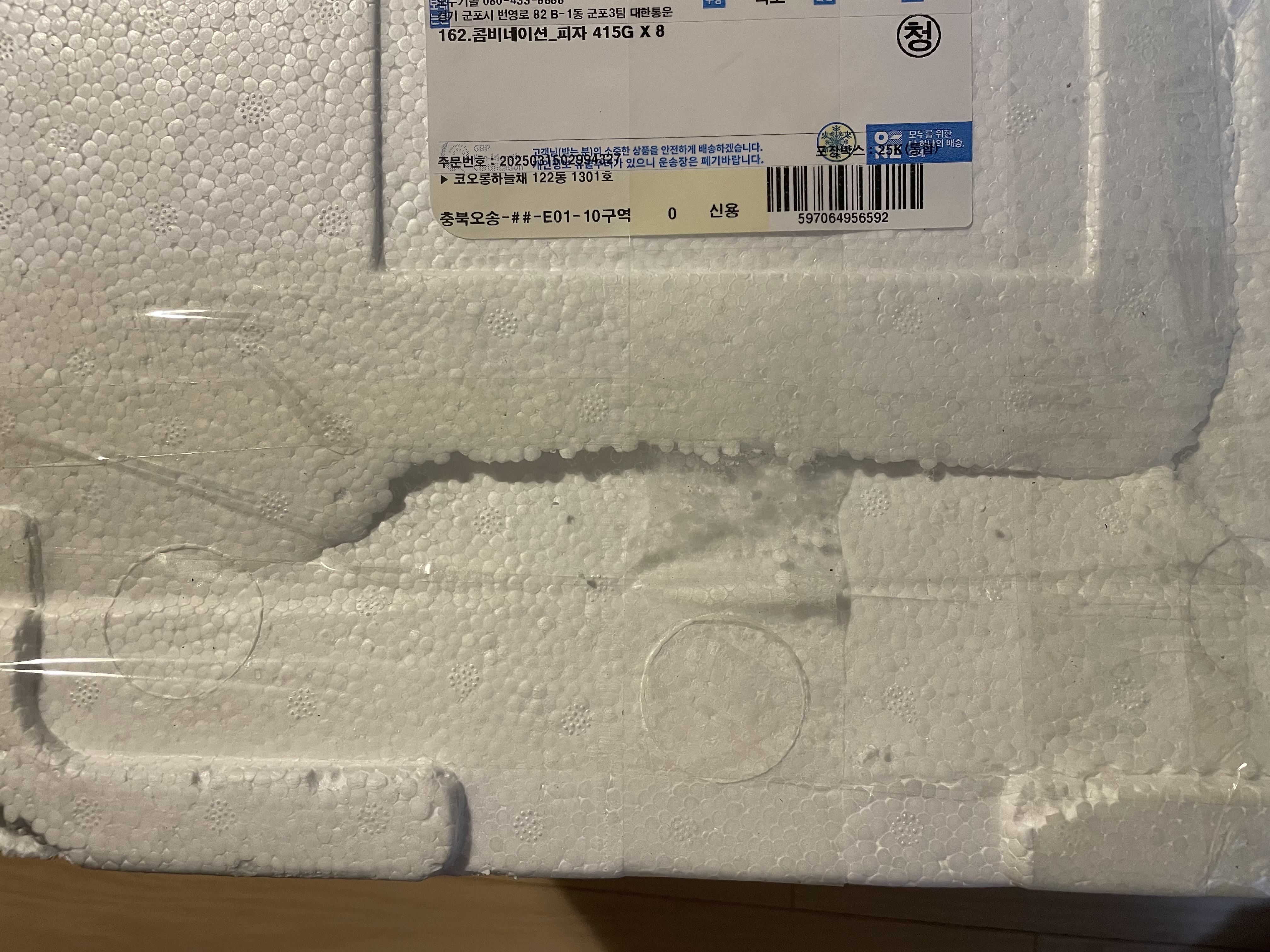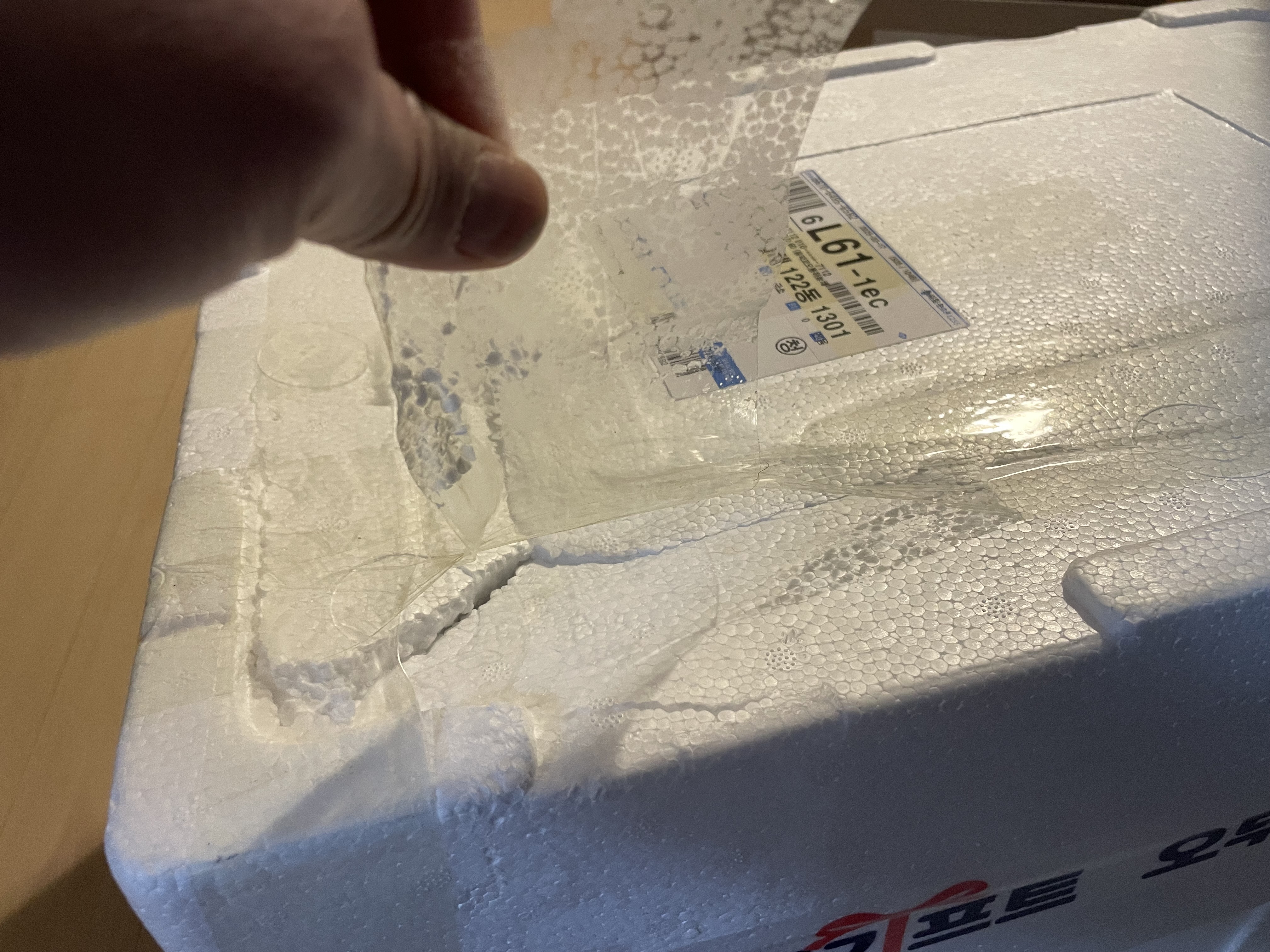 전화로 안내드린 내용과 같이 배송 과정 중 아이스 박스가 파손되어 택배사 측에서 임의로 테이핑 작업을 했을 것으로 예상됩니다.
