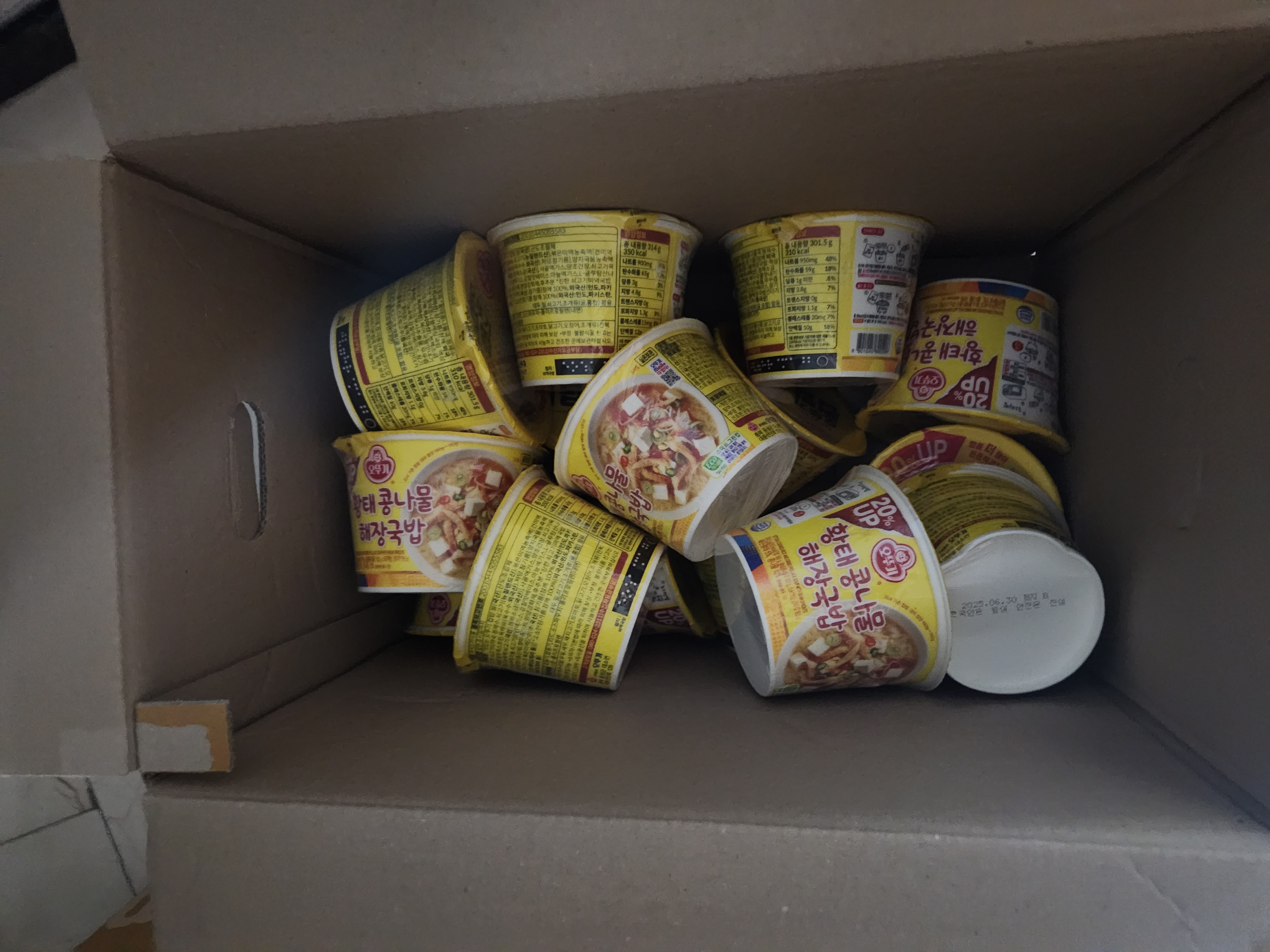 27개를 주문했는데 24+3개로 2박스에 담겨왔습니다. 그런데 24개 박스에 사진처럼 마구 담아 있어서 찌그러진 컵밥들이 많았습니다. 이왕에 두박스로 나누어 보내시면 크기에 맞는 박스에 포장하시거나 크기가 안맞으면 신문지라도 끼워보내면 찌그러짐을 방지할 수 있었을텐데 포장이 좀 아쉽네요. 식당에서 반찬그릇을 던져주신듯한 기분이었습니다.