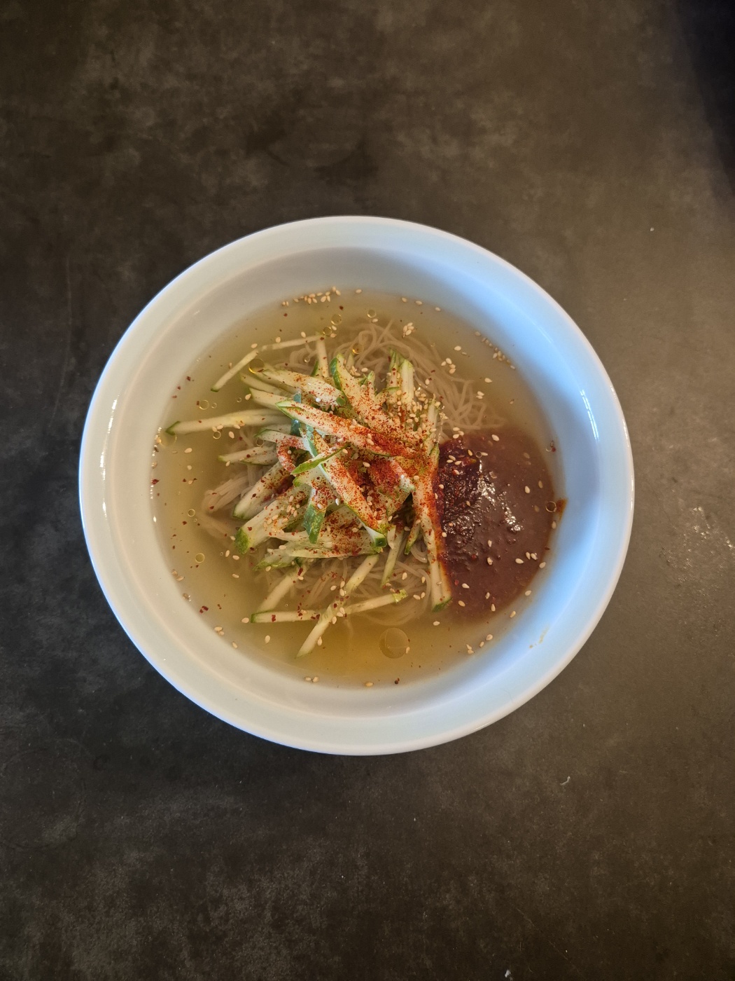 비빔냉면에 오뚜기 동치미 육수 부어주시고 오이 참기름 식초 소금 고추가루 통깨 넣어주면 밖 냉면 전문점 이상의 맛이 납니다🥢