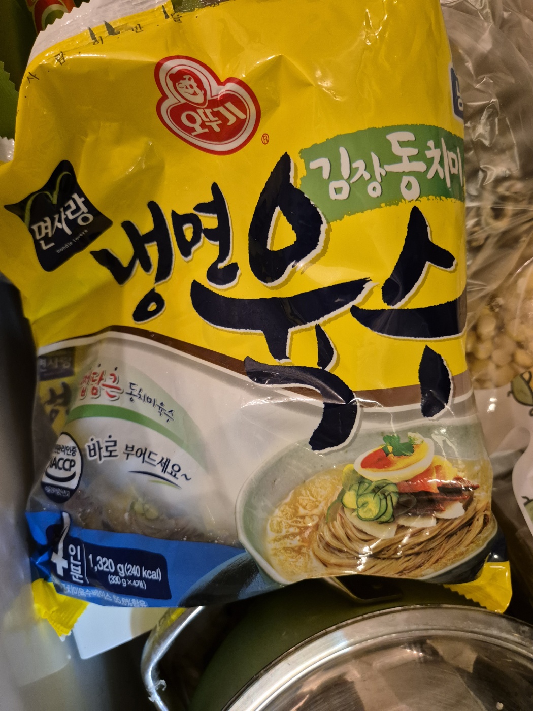 살짝 얼려서 오이만 추가해 먹어도 맛있고, 비빔라면 위에 부어 먹어도 별미에요. 타사들 냉면육수보다 새콤함은 줄이고 감칠맛은 높인 맛이에요.