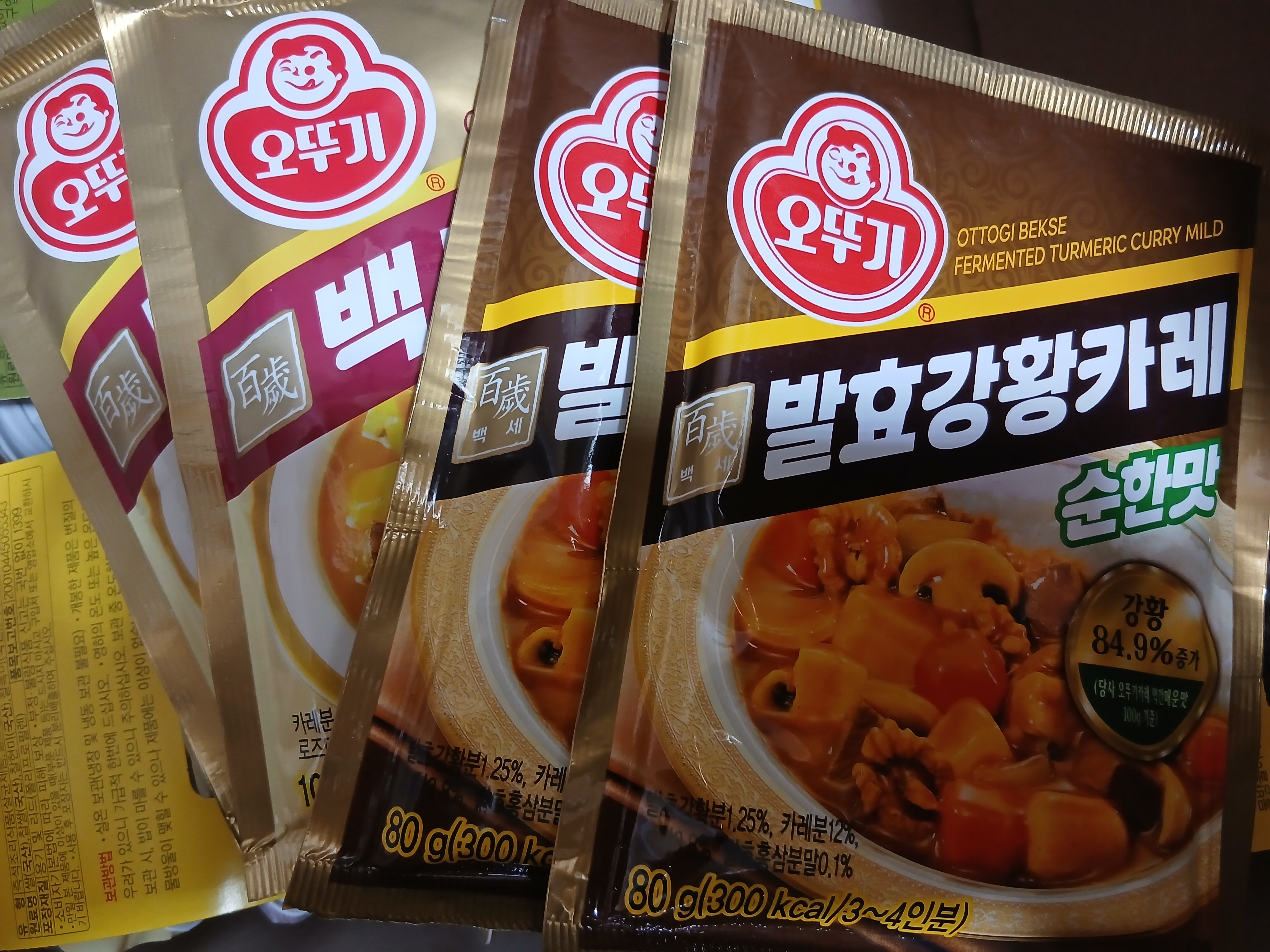 늘 3분카레나 오뚜기카레가루만 사먹다가 이번엔 강황이 더 많이 들어간 백세카레랑 발효카레 샀어요 더 진하고 맛있을듯 기대기대